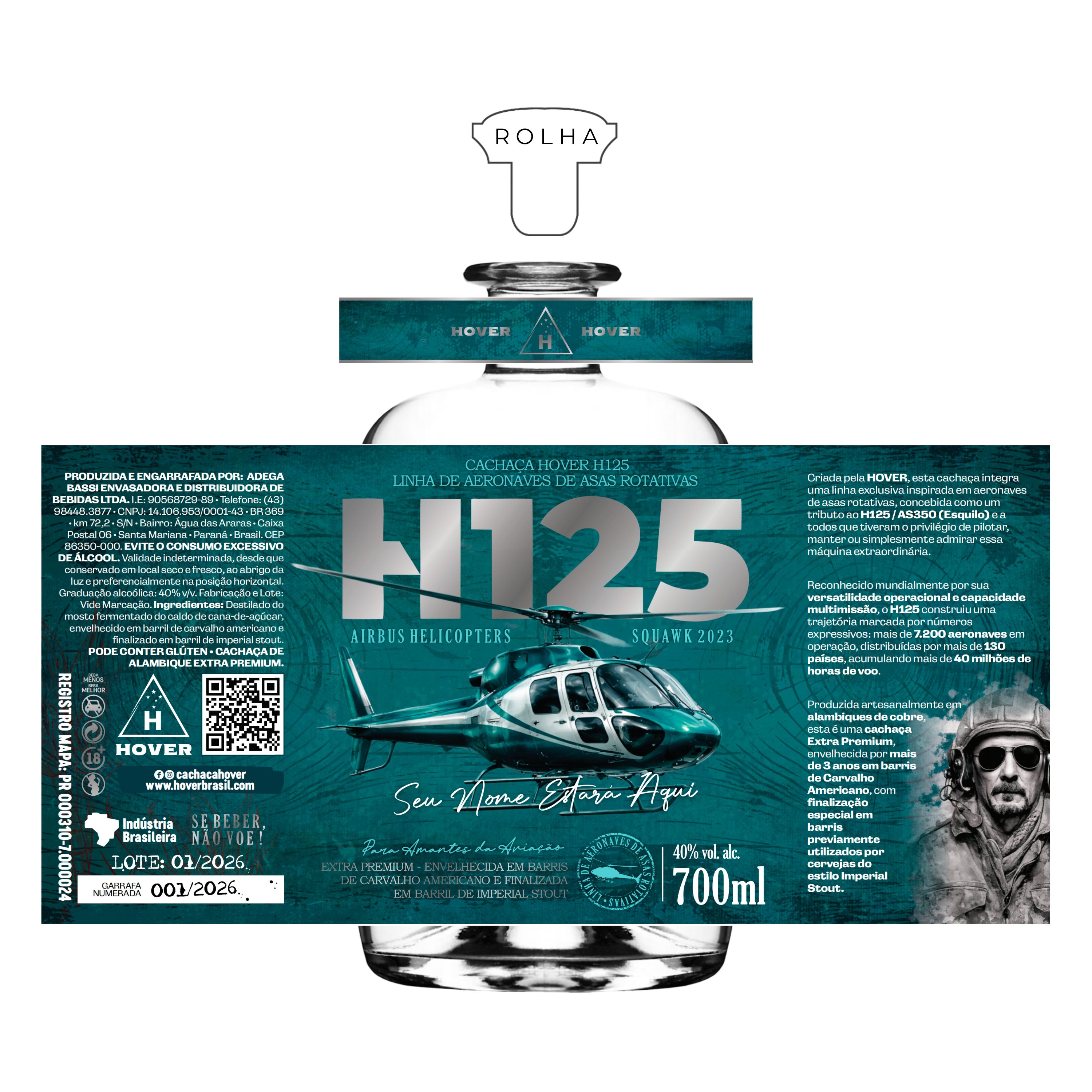 - Linha de Aeronaves de Asas Rotativas: A garrafa H125 será a primeira cachaça da linha de aeronaves de asas rotativas da HOVER.